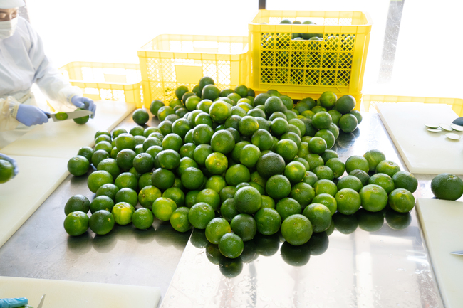 高品質な製品造りのため、柑橘の加工は熟練のスタッフの手作業を介して行っています。果実の部位を余すことなく、業務用原料からご家庭用製品まで豊富なアイテムの一次処理はここから始まります。