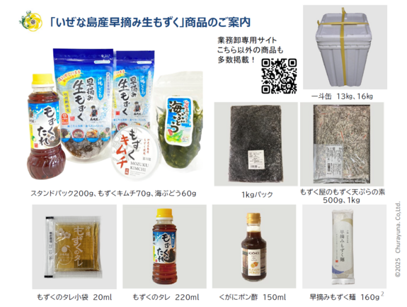 小売用の200gや500g、業務用の1㎏、4㎏、一斗缶、その他もずく含有量50%のもずく天ぷらの素や青切りシークヮーサー入りもずく専用タレ、木桶醤油と完熟シークワーサーを使ったポン酢、冷麺などにおススメのもずく含有量30%の早摘みもずく麺など。掲載できていない沖縄県産の海産物やフルーツ、アグー豚なども取り扱いございます。