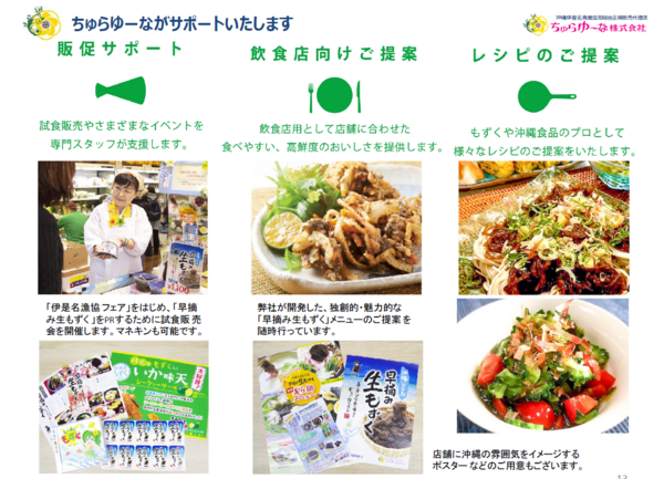 弊社は、2010年創業以来「生産者の顔が見える安全・安心な食材」「健やかな毎日をサポートする食材」「食卓が笑顔であふれる食材」を発掘し、お届けすることを目指す企業です。伊是名漁業協同組合正規販売代理店として、「早摘み生もずく」や「完熟生もずく」など海産物や農畜産物、県産食材の卸売業をしています。