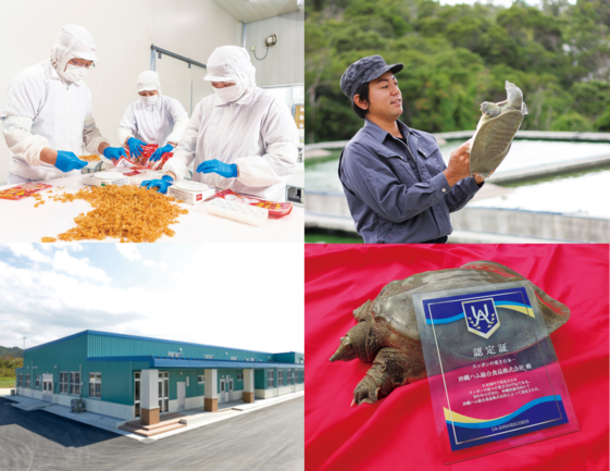 自然と共生した健康食品を作りたいとの創業者の想いから、沖縄県内初の大規模すっぽん養殖場が平成23年10月に始まりました。沖縄の自然、温かい気候とこだわりの飼料、地下水、サンゴ砂で育てられたすっぽんは成長もよく、臭みが少ないのが特徴です。2021年12月 日本一認定協会(UA-JAPANRECORDS)により重さ(8kg)日本一のすっぽんと認定されました。
