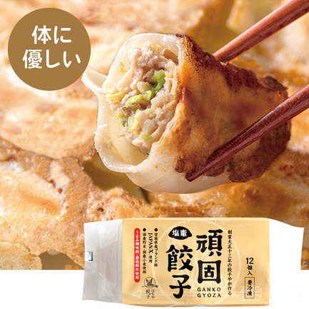 品名:頑固餃子・・・化学調味料や保存料をはじめ、食品添加物を使用せず、安心・安全と健康、そして美味しさを追求しました。スッキリとしたジューシーな肉汁で何個でも食べられる優しい味わいです。磯部理念に基づいた製法で、頑固一徹に味と無添加製法にこだわり、「頑固餃子」と名付けました。宮城県豚肉(蔵王JAPANX)、国産野菜、国産小麦粉100%使用。