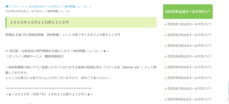 「食料新聞ニュース」は、毎号の新聞発刊後(1日、11日、21日)に購読者様向け、並びに全国480チェーン(SM、GMS、CVS、ドラッグストア、生協、百貨店、専門店)のバイヤー様向けに配信している公式メールマガジンです。新聞各号のトピックの他、「九州うまかモン」「信州ふるさと便」「イチ押し商品!」「工場長必見!関連資材」「総務・福利厚生サポート」「お店へ行こう♪」の登録会員様をローテーションにて告知。また、「イチ押し商品!」の新規登録企業様、並びに弊社電子版の人気コーナー「今週の記者のオススメ」に選ばれた商品は、アップデート時に個別にPRメールを配信、電子版の各サイトに誘引しPR効果を高めます。紙面掲載の新聞広告をバナー広告としてお届けするユニークな企画も好評です。