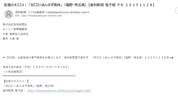 「おいしい新聞 食料新聞社®」は伝統食品の魅力を一般消費者に発信することを目的に開設したSNSページ(フェイスブック、インスタグラム、X(旧ツイッター))で、漬物・佃煮を始めとした伝統食品の最新情報を発信しています。同ページでは、紙面で紹介した商品情報を中心に、毎号弊社記者やスタッフが紙面上のオススメ商品を投票で決める「記者のオススメ!」、伝統食品業界の課題や”今”を伝える「ザ特集」など様々なコンテンツを連日更新中です。フォロワー数は、フェイスブックが2万9346人、インスタグラムが2828人、X(旧ツイッター)が1510人となり、合計フォロワー数は3万3684人(2025年12月4日時点)となっています。B to C 向けのコンテンツをさらに充実させ、和食への興味が高い一般消費者の方々に直接情報を発信し、漬物、佃煮を始めとした伝統食品の需要拡大に繋がるよう努めて参ります。