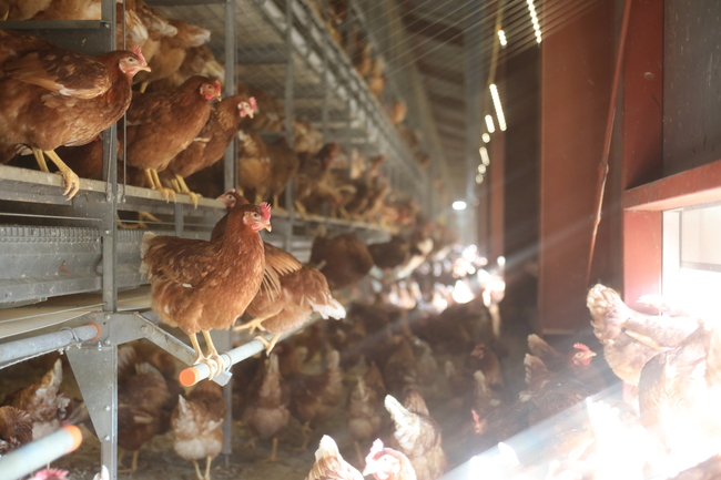 近年、アニマルウエルフェア(動物福祉)の観点から鶏のケージ飼いが話題となっております。このため当社では日本に2事例しかない欧州で推奨のエイビアリ鶏舎+ウインターガーデン付きの鶏舎を導入し、鶏に負荷をかけない飼養による卵の生産を行っております。