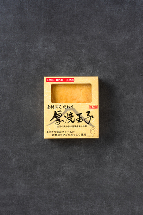 マルフクの卵を使用した「厚焼きたまご」と「プリン」は、素材の力を最大限に活かしたシンプルで贅沢な味わいが特徴です。厚焼きたまごは、焼津産鰹だしを使用した甘めの味付けで、寿司屋の専門職人が作るようなふっくらとした食感が楽しめます。火を入れても風味が濁らず、卵そのものの旨味とだしの上品な香りが広がり、そのままはもちろん、からしマヨネーズを合わせた厚焼きサンドとしても人気です。