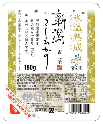 お米・肉・鮮魚・野菜といった食材は凍りそうになると、生存本能から凍結を防ぐため細胞レベルで変化します。「氷温熟成®」はこの原理を活用し、凍る直前の氷温域で静かに寝かせて、食材の持ち味を最大限に引き出す加工方法。吉兆楽の氷温熟成米は、この「氷温熟成®」技術でつくった極上米です。お米を一定期間マイナス2℃で熟成し、アミノ酸含有率の増加と単糖化を促しながら、旨みや甘みを向上させます。熟成により米粒内に分散する水分が均一にいき渡り、水分バランスも整うので、白くつややかで、もちもちした食感のおいしいごはんに炊き上がります。