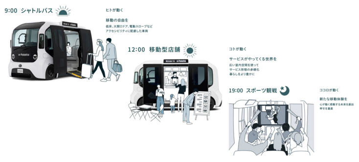朝と夜の通勤・通学時間は、シャトルバスとしてヒトを運び、お昼には充電しながらイロイロなコトを提供できます。