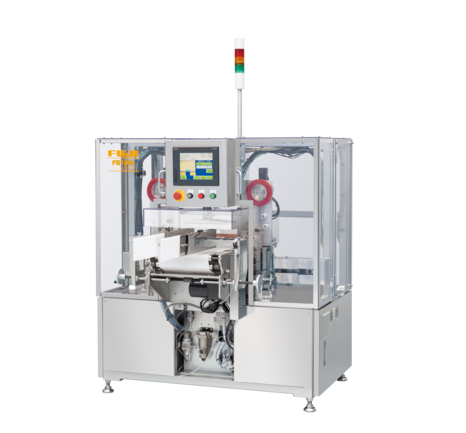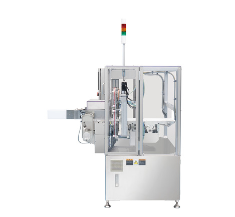 お弁当などのフタ付き容器に自動でテープ貼りをする機械です。