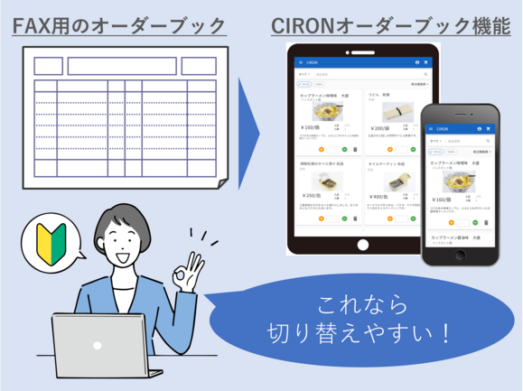 得意先様はこれまで発注した履歴と画像を見ながら、数量だけの簡単な入力で発注できるようになります。クラウドサービスのWeb受注システムですので、スマホ・タブレット・パソコンいずれかの端末があれば利用可能。普段から使い慣れているLINEから、CIRONをご利用できます。