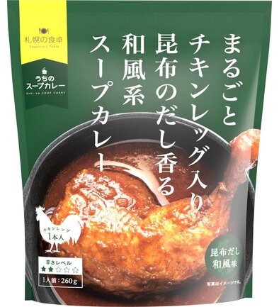 一口食べれば昆布出汁の効いた和風スープとチキンの旨みが口いっぱいに広がります。チキンレッグがまるごと入った和風ベースのスープカレーがご家庭で手軽に食べられる贅沢なスープカレーです。