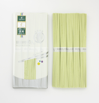 小麦の中心部分を使用した小麦粉と塩かどのないまろやかな伯方の塩で練った生地に、小豆島の老舗東洋オリーブの農園で収穫された小豆島産100%のオリーブ果実をふんだんに練り込みました。麺の表面にはオリーブ油を塗り、伝統的な「手延べ技法」で延ばしあげた小豆島らしいこだわりのオリーブ素麺です。