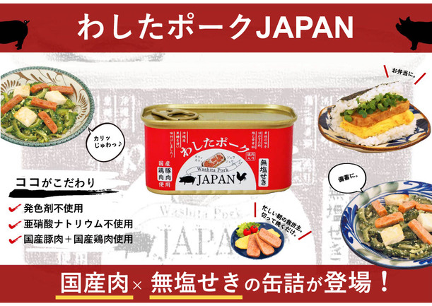 発⾊剤・着⾊料も不使⽤の国産無塩せきランチョンミート「わしたポークJAPAN」は