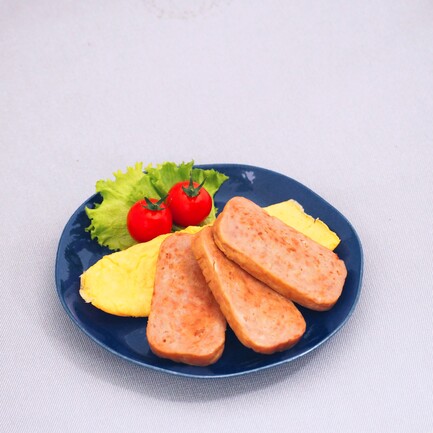 スライスしてカリっと焼いたポークを、玉子焼きと合わせて「ポークたまご」完成!