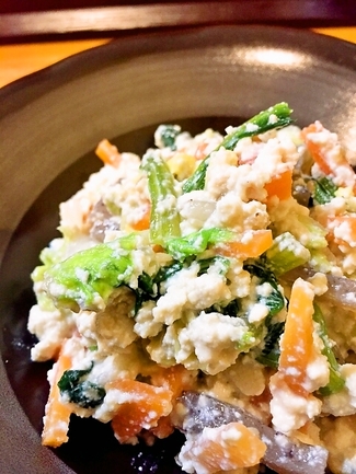 香ばしいゴマの風味をいかした、白和えづくりに最適な万能だれです。写真のように、ゆでた青菜や人参、糸こんにゃく、豆腐を合わせ、このたれで和えるだけで、手軽に本格的な白和えが完成します。豆腐のまろやかさとゴマのコクがしっかり調和し、家庭で作る白和えがぐっと味わい深く仕上がります。