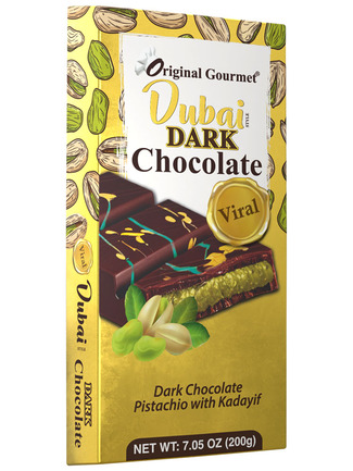 Dubai Style Chocolate combines rich dark chocolate, pistachios, and kadayif, offering a textured, flavorful experience in every bite.