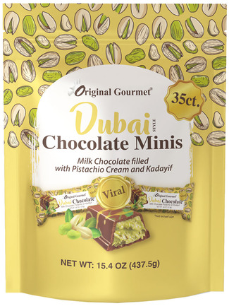 Dubai Style Chocolate comes in a mini version, with rich milk chocolate, pistachios, and kadayif for a textured, tasty experience.
