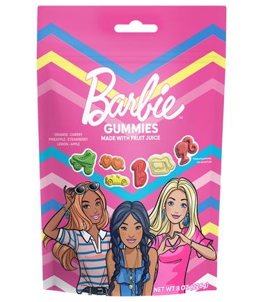 Barbie™ shaped gummies include six stylish shapes and six fruity flavors. Vibrant colors and playful details bring these gummies to life, creating a fun, nostalgic treat for fans of all ages.