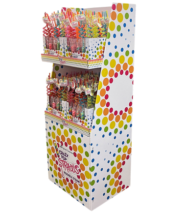Comes with 8 (30ct) PDQ displays filled with 25g swirl pops.