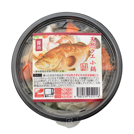 くえ(長崎県産)、すり身【魚肉(えそ(長崎県産)、いとより、すけそうだら)、食塩、卵白/調味料(アミノ酸等)、保存料(ソルビン酸K)】、白菜、にんじん、ネギ、しめじ、だし醤油【塩(国内製造)、砂糖、しょうゆ、果糖ぶどう糖液糖、クエ、酵母エキス/酒精、調味料(アミノ酸等)】、(一部に卵・小麦・大豆を含む)