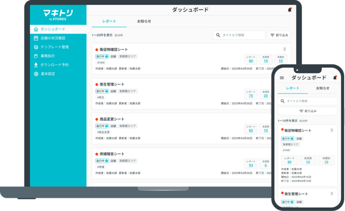 マキトリby STORESは本部・店舗・店舗内の情報流通の最適化が出来るサービスです。店舗の現場で働く方でも使いやすいように、スマホやタブレットにも対応。簡単に業務報告やオペレーション作業を共有できます。不要な業務を可視化・自動化することであらゆる問題を改善していくことが出来ます。