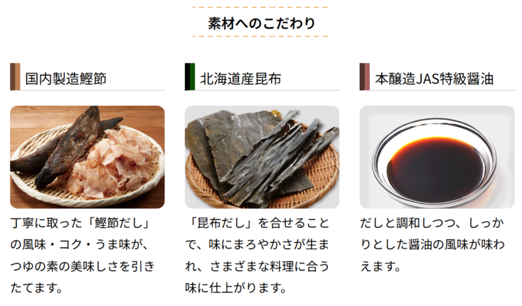 丁寧に取った「鰹節だし」の風味・コク・うま味が、つゆの素の美味しさを引きたてます。「昆布だし」を合せることで、味にまろやかさが生まれ、さまざまな料理に合う味に仕上がります。だしと調和しつつ、しっかりとした醤油の風味が味わえます。