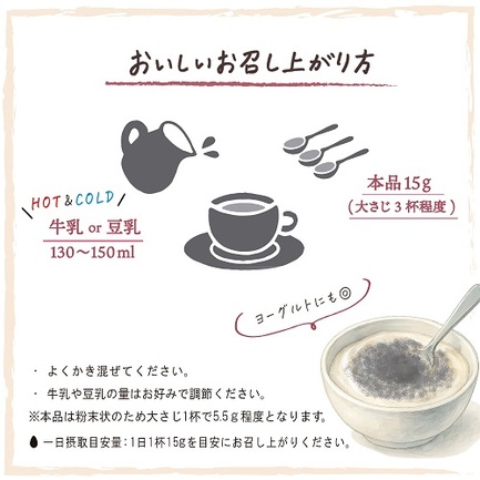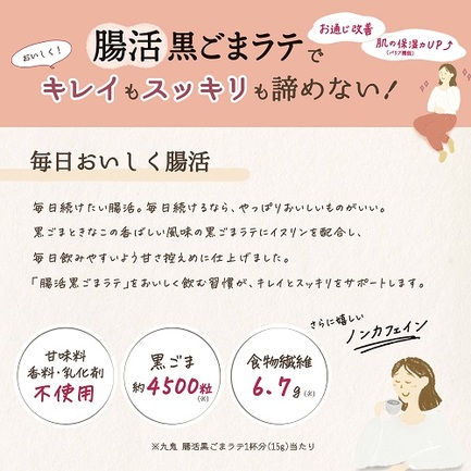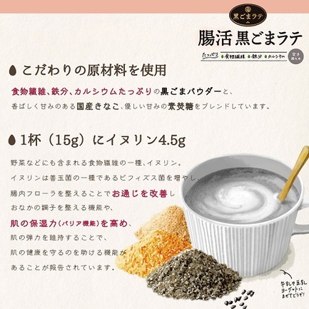 ビフィズス菌を増やし、お通じ改善や肌の保湿力(バリア機能)を高める機能があるイヌリンを配合した機能性表示食品の黒ごまラテ。牛乳や豆乳に混ぜるだけで美味しく腸活ができます。黒ごまときな粉の香ばしい風味と、すっきりとした甘さで毎日飲みやすく仕上げております。