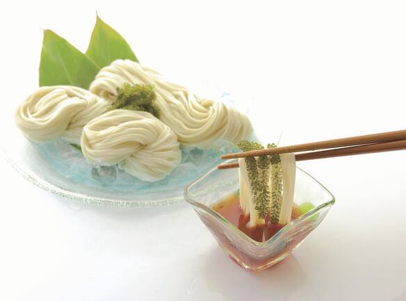 原料にこだわり油を一切使わない独自のノンオイル製法で、海ぶどうの粉を入れ作り上げた麺、「ぷちぷち海ぶどう麺」は、もちもちとして、のどごしがよく、最高級品質商品です。