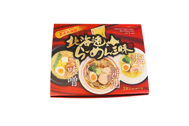 北海道産小麦100%使用の熟成乾燥麺と北海道産大豆を使用したさっぱりの中にキレのある醬油スープ、また同じく北海道産大豆をしようしたコクと深みのある味噌スープ、知床羅臼の海洋深層水使用のラウシップ(塩)スープの奥深い味が魅力です。拘りの三昧3食セットです。