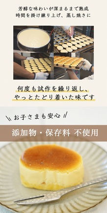厳選したチーズ群に生クリーム風味の源となるプレミアム発酵バターハイグレード鶏卵等をベースに芳醇な味わいが深まるまで熟成させ、時間を掛け練り上げ蒸し焼き致しました。