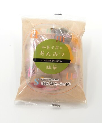 日光伏流水を使用した特製のこだわり寒天に、みかんとパイン、赤えんどう豆を加えたあんみつです。自家製国産抹茶蜜と丹念に練り上げた小倉こし餡が付属します