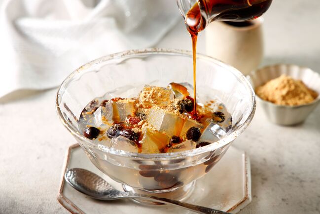 国産寒天とふっくらと炊き上げた北海道産赤えんどう豆がたっぷりと入った豆かんてんもおすすめです。別添で黒蜜と国産きな粉付きで、一度は食べていただきたい逸品です。