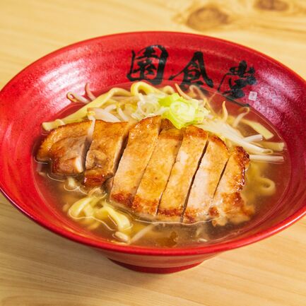 地元では「肉タン」と呼ばれ、長年愛され続けている故郷の味です。スープは塩ベース。このスープに甘辛く焼いた分厚いこだわりの豚肉ロース肉がド〜ンとのり、太い平麺に優しく絡んで、食べたことのないくせになる味です。