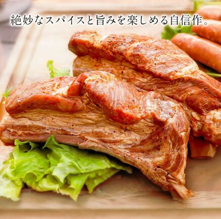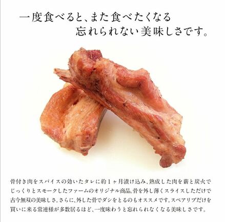 お肉の凝縮された旨味と絶妙なスパイスが美味! スモークしたスペアリブはファームのオリジナル商品。