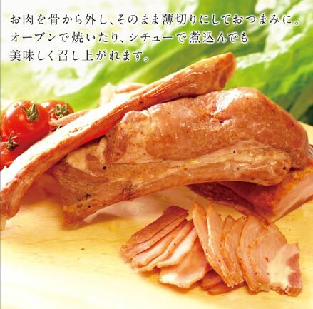お肉を骨から外し、そのまま薄切りにしておつまみに。オーブンで焼いたり、シチューで煮込んでも美味しくお召し上がりいただけます。