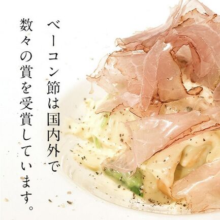 弊社独自の氷温熟成ベーコンと製造プロセスに日本独自の鰹節の製法を掛け合わせて作り上げました。パスタなどへトッピングすることで、お肉の味わいと薪・炭火の香りをお料理のアクセントとしてお楽しみいただけます。