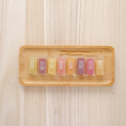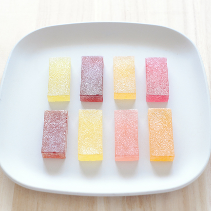 水飴(国内製造)、砂糖、果汁(りんご、ぶどう、いちご、もも、うめ、ざくろ、あんず、ゆず)、粉末オブラート(でん粉)/ゲル化剤(ペクチン)、酸味料、香料、着色料(アカキャベツ、紅花黄、紅麹、くちなし)、レシチン(大豆由来)