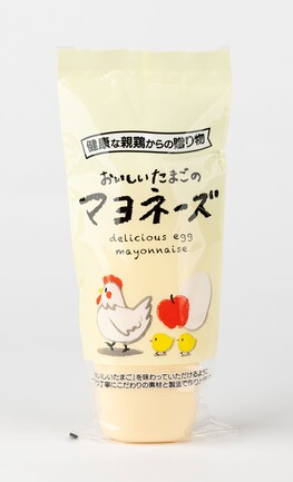 薬品添加の無い自家配合飼料で育てられた健康な親鶏の産んだ「おいしいたまご」を自社で割卵し、その新鮮なたまごを使ってマヨネーズを作りました。たまごのおいしさを味わっていただけるマヨネーズです。