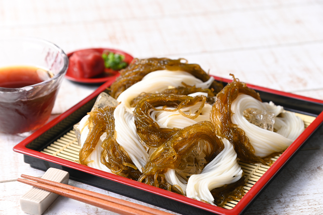 湯がいたそうめんと一緒に、梅干しを入れためんつゆにつける食べ方です。さっぱりしているので、暑い夏も乗り越えられます。
