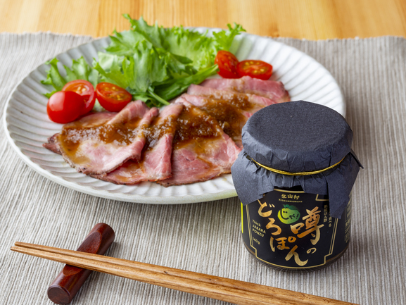 「のっけて食べる」新感覚ぽん酢。じゃばらの果皮ペーストをたくさん使用しているためどろどろとした質感が特徴。料理にしっかり絡み、じゃばらの風味を存分に楽しめる他にはないタイプのぽん酢です。