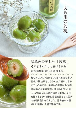 和歌山県が誇る希少な果実「若桃」を、上品なコンポートに仕上げました。翡翠色の美しい果実は、硬核期(こうかくき)と呼ばれる種ができる前の早摘み桃。見た目は梅のようですが、口に含むとふわっと広がる桃の香りとやさしい甘さが特徴です。種がないため、丸ごとお召し上がりいただけるのも嬉しいポイント。収穫時期が限られているため希少価値が高く、贈答品としても人気があります。美味しさを追求し、試行錯誤を重ねて3年。自信を持ってお届けできる逸品です。和歌山の自然と技が詰まった若桃の味わいを、ぜひご堪能ください。