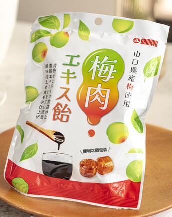 梅肉エキスは、自社関連農園で育てた山口県産の青梅を使用し、自社工場で製造しています。青梅1kgから約20g程度しか作れない貴重なエキスを飴に配合し、親しみやすくしました。酸味は控えめの為、お子様からご年輩まで幅広くお楽しみいただけます。