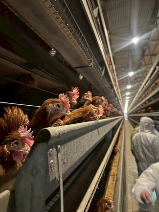 狭すぎず混雑しすぎないケージ飼いは、生産性と鶏の快適さのバランスを考えた工夫です。