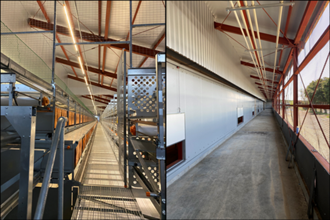 エイビアリー鶏舎では、鶏の行動に合わせて「卵を産む場所」「餌を食べる場所」「休む場所」が立体的に分かれており、衛生管理にも優れています。