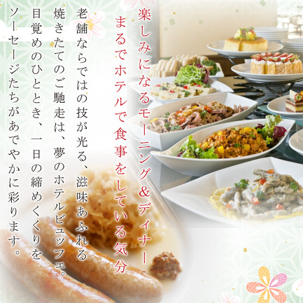 老舗ならではの技が光る滋味あふれる焼きたてのご馳走は、夢のホテルブュッフェ。目覚めのひとときモーニングを、一日の締めくくりのディナーを、ソーセージたちがあでやかに彩ります。