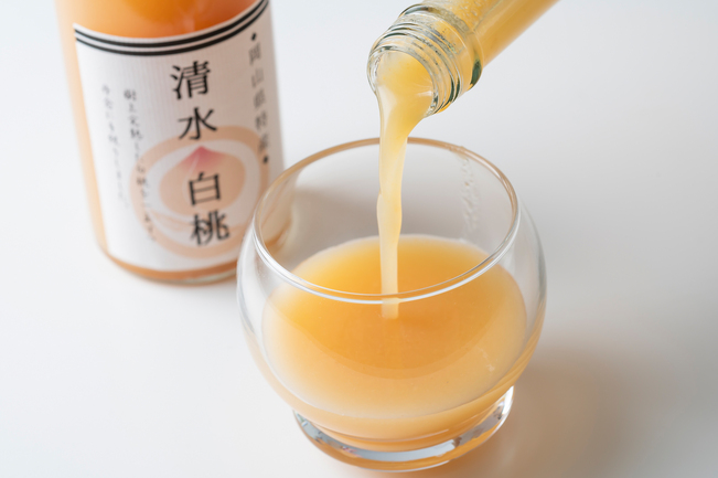 岡山県産の清水白桃のみを使い、手間ひまをかけて搾った果汁を瓶づめしています。