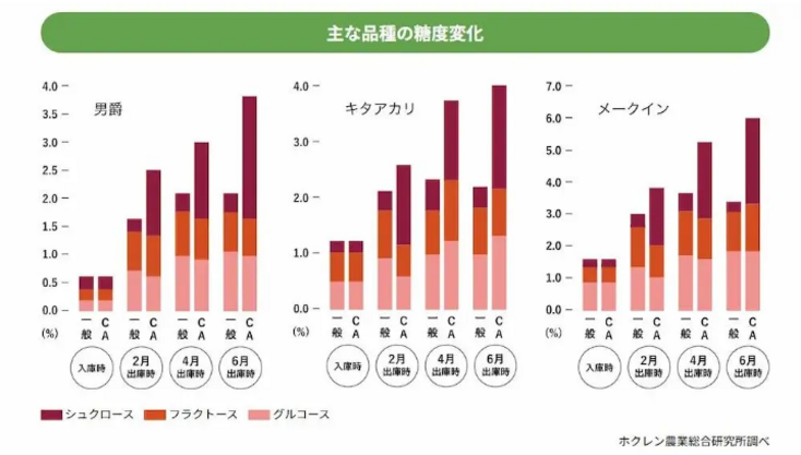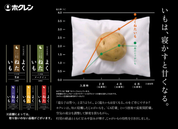 「寝る子は育つ」と言うように、よく寝たいもは甘くなる、のをご存じですか?ホクレンは秋に収穫したじゃがいもを「CA貯蔵」という技術で長期期間貯蔵。空気の成分を調節して、じゃがいもの呼吸を止める、つまり眠らせることで鮮度を保ちながら、時間の経過とともに甘みや旨味が増す、じゃがいもの特性を引き出しました。