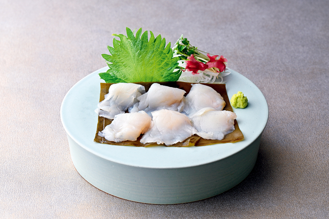 福井県産のマフグを昆布〆に。アルコール凍結機を使用し鮮度を落とさずに仕上げました。