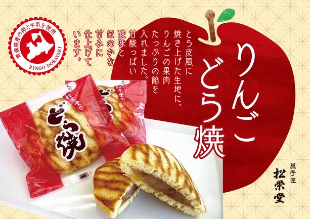 生地に県産の卵、牛乳を使用し、とら皮風に焼き上げております。餡には県産りんごをたっぷりと入れ、りんごの甘酸っぱい酸味と生地のほのかな甘みを楽しめます。