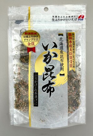 調味昆布(昆布(北海道産)、醸造酢、還元水飴)、調味いか(いか、砂糖、食塩)、ごま、ツノナシオキアミ、砂糖、食塩、アオサ/調味料(アミノ酸等)、ソルビット、(一部にいか・ごまを含む)