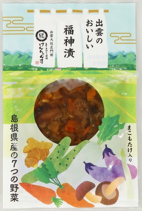 美味しい島根の7種類の野菜に出雲の丸大豆醤油、砂糖、みりんで味付けしました。出雲大社のしめ縄にも使われるまこもから採れるまこもたけも使った干し椎茸の旨味が生きた福神漬です。ご飯におつまみにもよく合います。